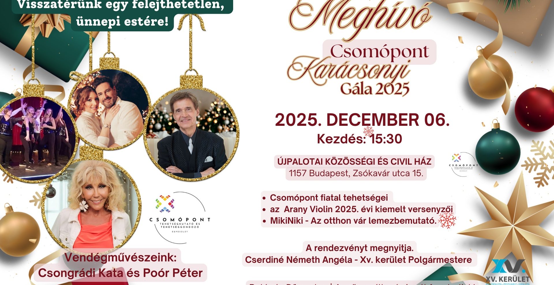 Visszatér az egyik legvártabb decemberi program Újpalotán: a Csomópont Tehetségkutató és Tehetséggondozó Egyesület idén is megrendezi hagyományos Karácsonyi Gáláját, amelyre 2025. december 6-án, szombaton 15:30-kor kerül sor az Újpalotai Közösségi és Civil Házban (1157 Budapest, Zsókavár utca 15.).